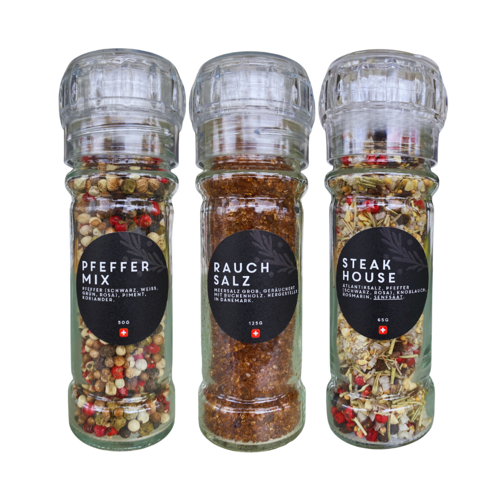 Dieses Gewürzset ist die perfekte Kombi für deine Grillgerichte. Kaufe sie im Set und spare 15%. Das Set enthält einen Pfeffermix, ein dänisches Rauchsalz und eine Steakhouse Gewürzmühle.