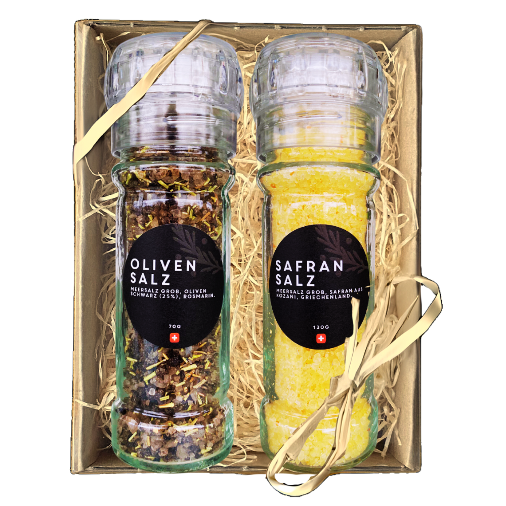 Geschenkset mit Gewürzmühlen mit Keramikmahlwerk bestehend aus einem Oliven- und einem Safransalz, verpackt in einem Geschenkkarton mit Holzwolle und Klarsichtdeckel.