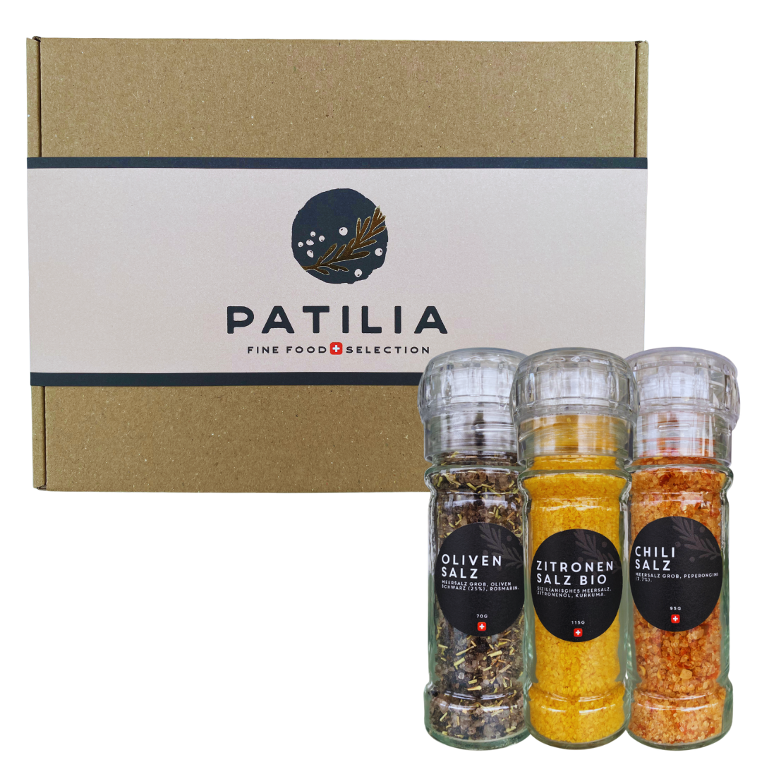 3er Geschenkbox mit Olivensalz, sizilianischem Ziitronensalz (bio) und einem Chilisalz. Die perfekte Kombination für die mediterrane Küche. Gewürzmühlen mit Keramikmahlwerk.