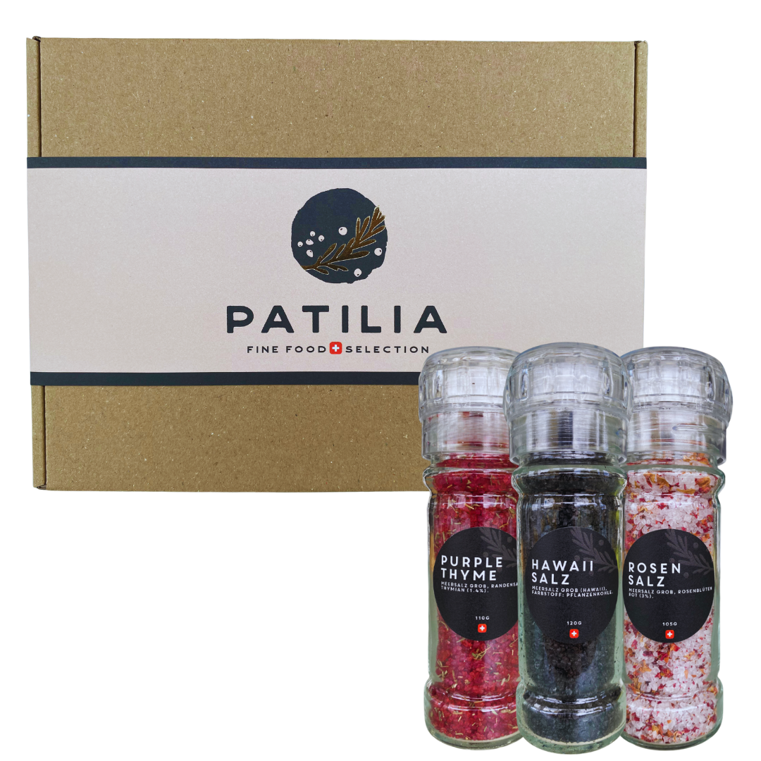 Geschenkbox mit Purple Thyme, Hawaii Salz und Rosensalz. Für alle, die es gerne bunt mögen! Die Gewürzmühlen sind mit Keramikmahlwerk.