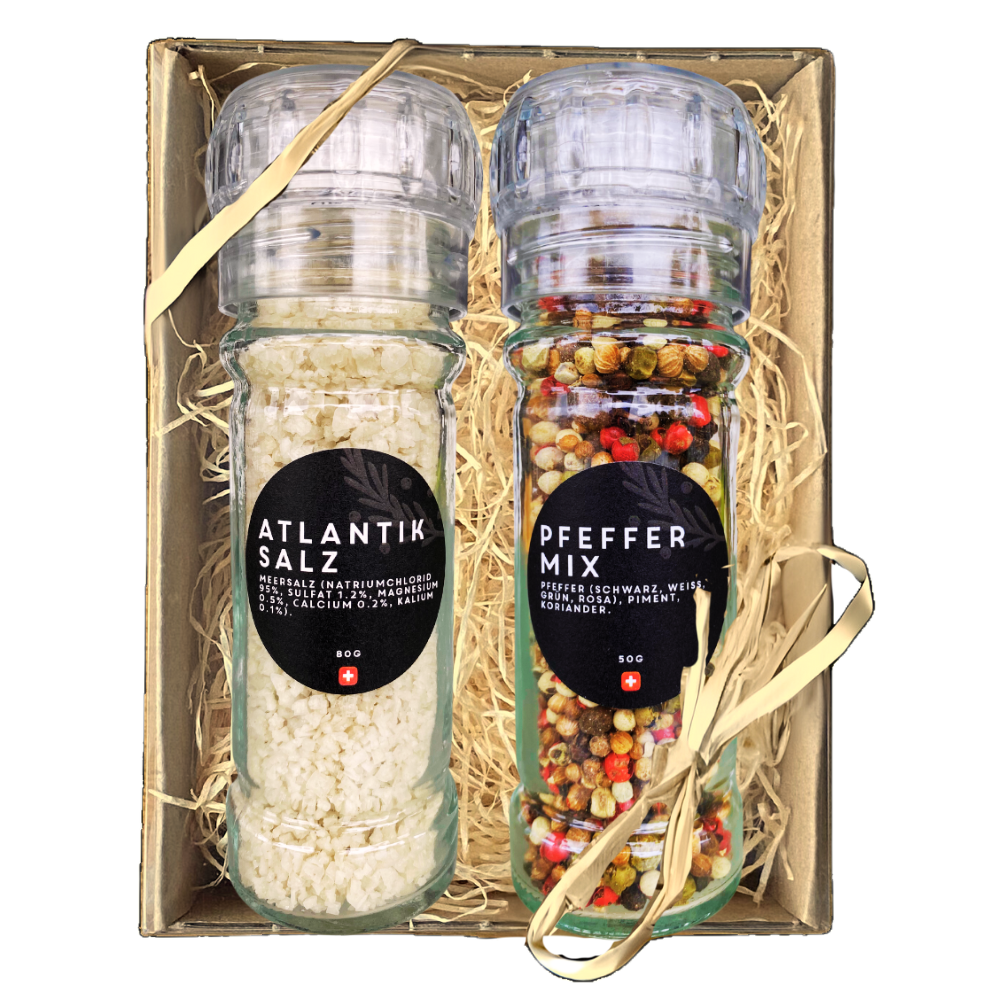 Geschenkset mit Gewürzmühlen mit Keramikmahlwerk bestehend aus einem Atlantiksalz und einem Pfeffermix, verpackt in einem Geschenkkarton mit Holzwolle und Klarsichtdeckel.