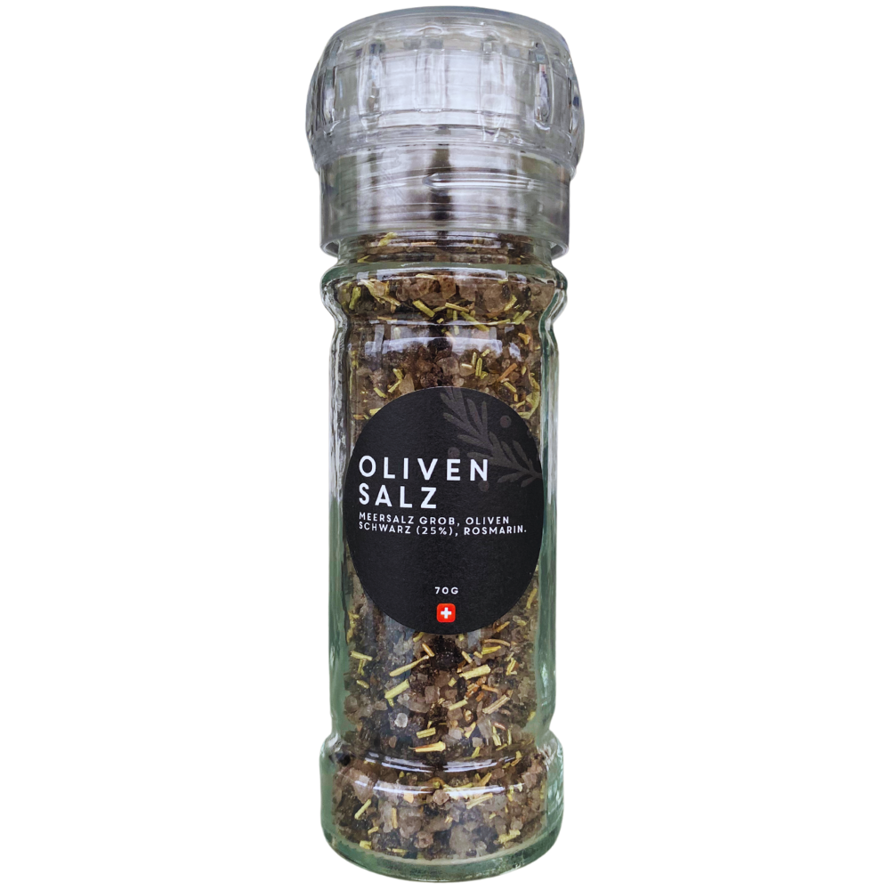 Gewürzmühle mit Keramikmahlwerk mit grobem Meersalz verfeinert mit schwarzen Oliven und getrocknetem Rosmarin. 70g