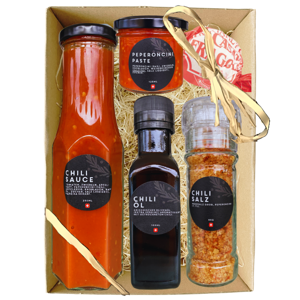 Geschenkbox mit Klarsichtdeckel (A5 Format). Enthaltene Produkte: Chilisauce 250ml, Peperoncinipaste 125ml, Chilisalz Gewürzmühle mit Keramikmahlwerk, Chiliöl 100ml und Amaretti Fragola.