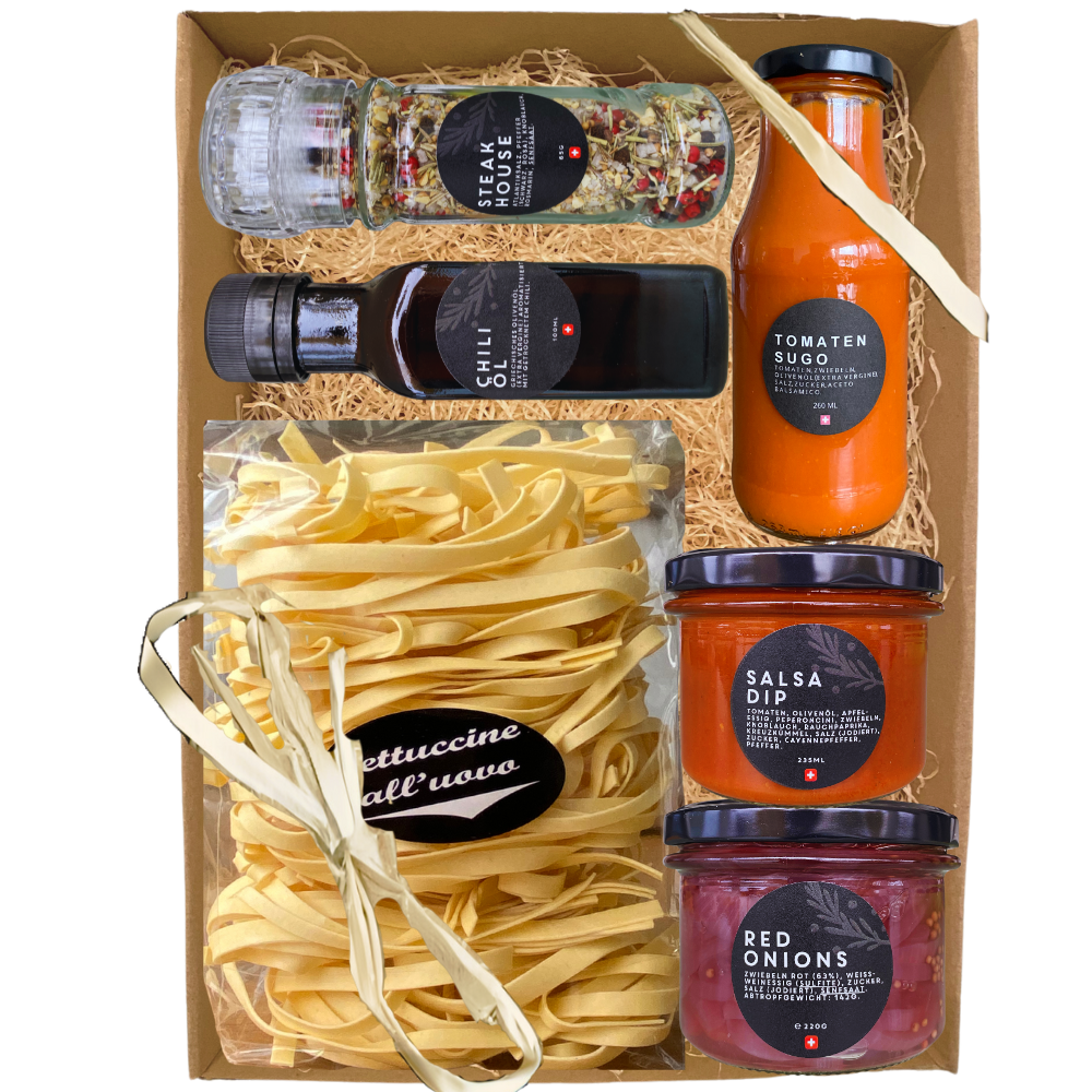 Grosse Geschenkbox (A4 Format) mit Klarsichtdeckel mit folgenden Produkten: Fettucine all'uovo, Tomatensugo 260ml, Chiliöl 100ml, Steakhouse Gewürzmühle mit Keramikmahlwerk, Red Onions Pickles, Salsa Dip.